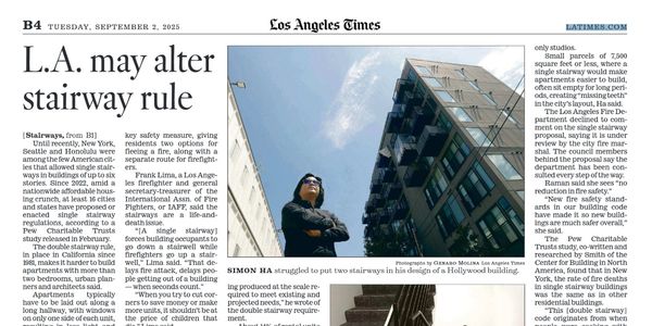 Featured in the LA Times article written by Noah Goldberg, Los Angeles’ proposed Single-Stair Reform would allow mid-rise apartments up to six stories to use one fire-rated, sprinkler-protected stairway instead of two. Simon stated that this change could make housing more affordable, livable, and feasible on small infill sites. Eliminating a second stairway frees space for larger, cross-ventilated units with more natural light, while reducing costs by 6–13%. Common in Europe and parts of the U.S., single-stair buildings maintain strong safety records. Simon views the reform as a design-driven strategy to unlock “missing-middle” housing and create more diverse, human-scaled neighborhoods.